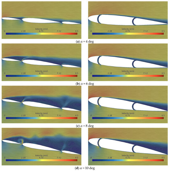 Analyses of the detailed characteristics of the flow field around the wingsails, such as velocity contours and vortex shedding patterns, can provide mechanistic explanations of the previous findings. The flow field patterns around the bare and concave wingsails at AOAs of 4, 6, 8, and 10 degrees are shown in Figure 15. The results indicate that the flow field on the surface of the bare wingsail remains stable at an AOA of 4 degrees. However, when the AOA is increased to 6 degrees, vortex shedding initiates on the suction side of the nose. As the AOA is further increased to 8 and 10 degrees, this vortex shedding pattern becomes more complex and intense, which explains the large fluctuation observed in the force coefficient curves. In contrast, the flow field on the suction side of the concave wingsail remains relatively stable across all AOAs. In addition, at an AOA of 10 degrees, slight flow separation occurs on the suction side of the concave wingsail’s flap, resulting in the high-velocity fluid moving away, thereby reducing the pressure difference. This corresponds to the sudden decrease in the lift coefficient (as shown in Figure 8).