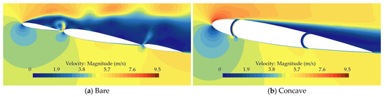 The velocity contours for the two wingsails are also notably different, as shown in Figure 16. The results indicate that, while the velocity distributions are similar on the pressure side, they significantly differ on the suction side. For the bare wingsail, flow separation occurs at the leading edge of the nose, causing the high-velocity fluid to move away from the surface of the wingsail, resulting in a lower pressure difference and thus a lower lift coefficient. In contrast, for the concave wingsail, flow separation on its suction side occurs at the trailing edge of the nose, leading to the better adsorption of high-speed fluids and a narrower low-speed zone. This difference results in a higher pressure difference between the two sides of the wingsail, thereby leading to a higher lift coefficient, which confirms previous aerodynamic findings.