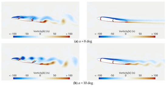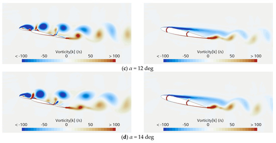 In order to obtain a comprehensive understanding of the aerodynamic performance of both the bare and concave wingsails, we have continued to study the aerodynamic performance at higher AOAs. As shown in Figure 17, it is found that when the AOA is greater than 10 degrees, the vortex shedding patterns on the suction side of the original wingsail (bare wingsail) are similar, while the vorticity intensity increased along with it. Similarly, the steady flow on the suction side of the optimized wingsail (concave wingsail) gradually evolves into a periodic vortex shedding pattern, and the vorticity intensity is also significantly increased. In engineering applications, the high-intensity vortex shedding will cause unstable aerodynamic performance, and the oscillating lift and drag can cause fatigue of the wingsails’ structures. In the present study, we focus on the stable and efficient aerodynamic performance of wingsails. Therefore, further research will mainly focus on medium and small attack angles in the following text.