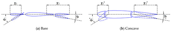 In order to assess the differences between bare and concave wingsails with different folding patterns, a camber is introduced, as depicted in Figure 18. θ1 and θ1* represent the camber angle of the nose, while θ2 and θ2* represent the camber angle of the flap. To simplify this study, the position of the pivot is kept the same for both wingsails, with x1 = x1* = 0.2 c, and x2 = x2* = 0.4 c. In practical engineering applications, the nose (or flap) and main body are connected by hydraulic telescopic rods, and the two ends of the rods are fixed on the rotating axes of the nose (or flap) and main body, respectively. This mechanism of attachment ensures that the nose and flap can generate cambers to further enhance the thrust performance. The effects of these two components are first evaluated separately in this paper and then collectively in a subsequent study.