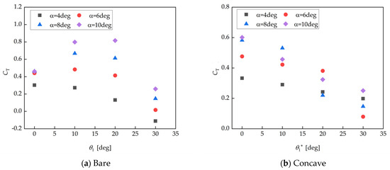 Figure 20 shows the thrust coefficient results of bare and concave wingsails with only the flap rotating. Within the camber range of 0 to 70 degrees, the thrust coefficients of both the bare and concave wingsails exhibit a trend of initially increasing and then decreasing. This suggests that rotating the flap enhances the thrust performance of both the bare and concave wingsails, and this effect is more significant than that of the nose. Similarly, quantitative comparisons are conducted at an AOA of 8 degrees. The analysis shows that the bare and concave wingsails achieve maximum values of 1.47 and 2.06 at a flap camber angle of 50 degrees, respectively, representing a difference of 40.1%. In addition, the thrust coefficient is improved by 19.0% and 53.5%, respectively, compared with the unfolded configuration.