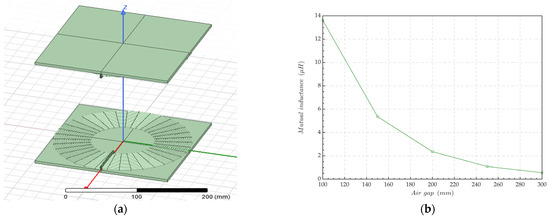 Magnetic simulation of circular charging pads. (a) Simulation models with an air gap of 200 mm; (b) mutual inductance of the charging pad under different air gaps.