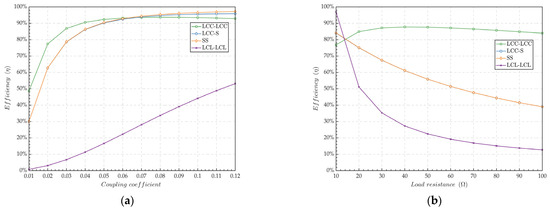 Influence of different parameters on transmission efficiency in LCC-LCC, LCL-LCL, LCC-S, and SS. (a) Only considering the equivalent resistance of the inductors and RL = 20; (b) k = 0.027.