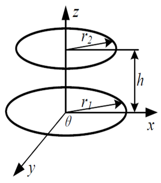 According to Maxwell’s theory, the M of the coupling coils is related to the coil current in a single period. Take an asymmetric, single-layer coupling coreless circular coil without misalignment as an example, as shown in Figure 4.