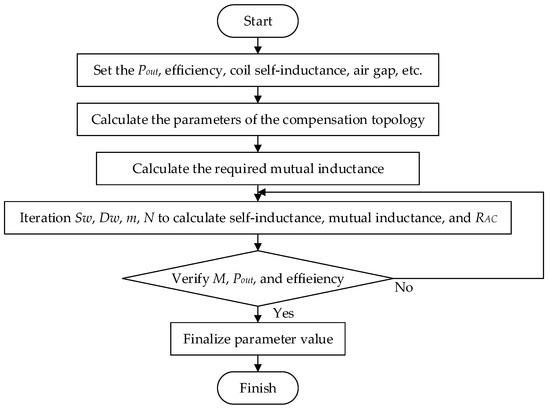 The coupling coefficient is less than 0.03 when the coil diameter and air gap are equal, so M should be increased as much as possible to make the double-sided LCC compensation topology work efficiently under a weak coupling coefficient. In this work, the coil diameter and the air gap have been determined, so the coupling coefficient can only be improved by designing the number of coil layers, turns, wire diameter, and wire spacing. By using Equations (6) to (12), the coreless circular coil parameters of a weak coupling IPT system are calculated and designed. The detailed design process is shown in Figure 5.