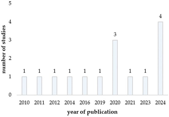 It was observed that the first works from the given research period were created relatively recently, in 2010. In recent years, 2010–2024 (up to July), the number of works has been relatively small, because one work was published per year, excluding 2020 (3) and 2024 up until July (4). Therefore, it can be concluded that the selected research area that covered the improvement of photovoltaics in terms of quality and at the same time limiting their negative impact on the environment in LCA is in the initial development phase. This research topic is not popular and may have numerous research gaps.