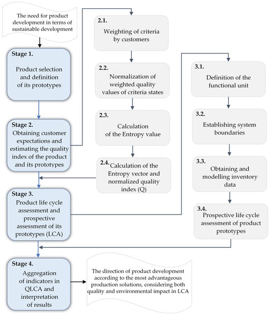 The QLCA method was developed in four main stages, i.e., (1) product selection and definition of its prototypes, (2) obtaining customer expectations and estimating the quality index of the product and its prototypes (Q), (3) product life cycle assessment and prospective assessment of its prototypes (LCA), (4) aggregation of indicators in QLCA and interpretation of results. The algorithm of the method is presented in Figure 3.