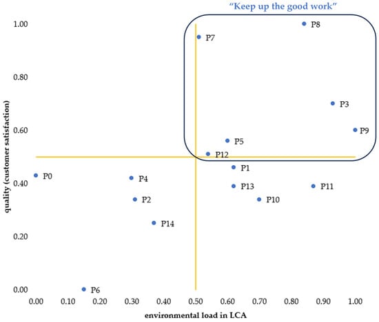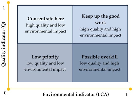 The Quality Indicator (Q), relating to customer satisfaction with the use of products, and the Environmental Indicator (LCA), relating to the environmental burden of products during their life cycle, are aggregated into a coherent quality and environmental indicator (QLCA). The purpose of aggregation is to ensure a simultaneous analysis of products and their prototypes in terms of their quality and environmental impact on the life cycle. This is possible because both indicators are normalised on a scale of 0 to 1. The aggregation of the Q indicator with the LCA indicator into one QLCA indicator takes place using the modified IPA (importance–performance analysis) model [67]. IPA is a simple technique that can be applied in the analysis of any area, including those related to product development [68]. In the proposed QLCA method, it is used for simultaneous qualitative and environmental analysis, as shown in Figure 4.