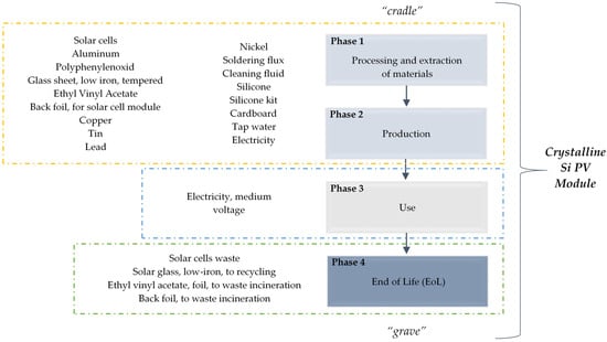 Activities aimed at achieving the climate goals of the European Union (EU-27) for 2050 [1] mean that heating and cooling technologies, such as photovoltaic (PV) panels, are becoming increasingly important in reducing negative climatic changes by improving air quality and reducing carbon dioxide (CO2) emissions [2]. They reduce negative climatic changes by having beneficial impacts on improving air quality and reducing carbon dioxide emissions [3]. Despite this, they require the increased use of limited materials, which are increasingly being considered recyclable [4], but also in the form of obtaining high-quality materials [5]. Furthermore, global climate change makes it important to switch to more sustainable electricity production techniques, including ensuring environmental protection throughout the life cycle (LCA) of green energy generation technologies [6]. Among the key ones are photovoltaic systems [7]. In a life-cycle context, they enable the use of fewer resources than conventional electricity sources. However, it is necessary to consider the environmental impact of these products in terms of their entire life cycle, which can also be applied to the acquisition and extraction of materials, the production process, and the mentioned use and recycling [8].