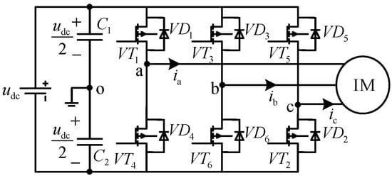 Developing electric vehicles can slow down the pace of global climate change [], reduce pollution, and effectively save energy []. Among numerous inverter topologies, the voltage source inverter (VSI) has fewer power devices, a simple structure, and mature and easy control technology, so it is the most commonly used drive topology in electric vehicles []. To prevent short-circuits occurring in the VSI bridge arm, the turn-on process of all switching tubes requires a delay, so the dead-time is formed, and both switching tubes of the upper and lower bridge arms are in the off-state []. The dead-time and conduction voltage drop lead to a nonlinear error in the VSI output voltage; especially for electric vehicle drive systems, the stator current harmonic distortion and torque ripple caused by the nonlinear voltage error cannot be ignored [], because the electric vehicles will experience noticeable bumps and whistles []. For sensorless systems, the output voltage nonlinear error will reduce the accuracy of the flux and speed observers [].