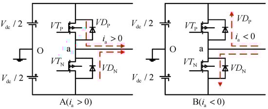 The schematic diagram of phase-A in VSI is shown in Figure 2. When the phase current ia > 0, if the upper phase leg switching tube VTP is turned on, the current flows through VTP; otherwise, when the upper phase leg switching tube is turned off and the lower phase leg switching tube is turned on, the current will not flow through VTN, but will continue to flow through the diode VDN. It means that when the phase current ia > 0, no matter whether the VTN is turned on or off, it will not work. Similarly, when the phase current ia < 0, VTP is in an invalid state.