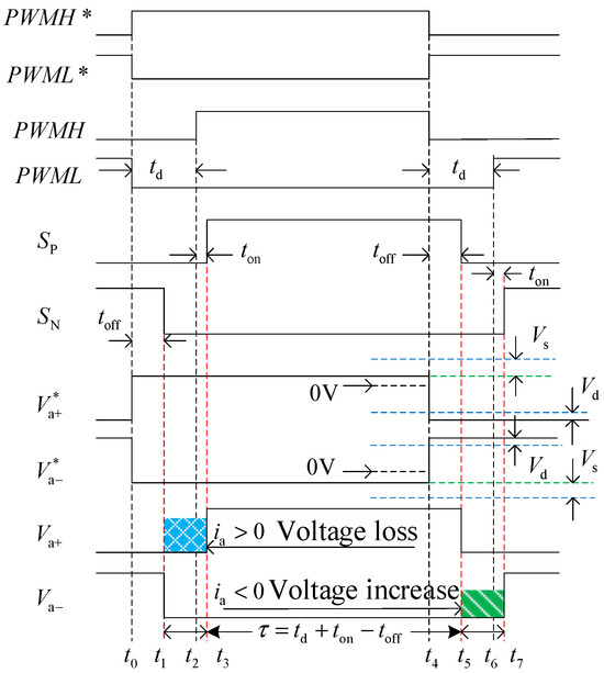 The dead-time effect of a single phase leg in VSI is shown in Figure 3, where PWMH* and PWML* are ideal complementary drive signals; PWMH and PWML are the actual drive signals applied to the switching tubes after adding the dead-time; SP and SN are the actual switch waveforms considering the turn-on and turn-off delays; td is the dead-time; ton is the turn-on delay time; toff is the turn-off delay time; Vd is the diode conduction voltage drop; Vs is the switch tube conduction voltage drop.