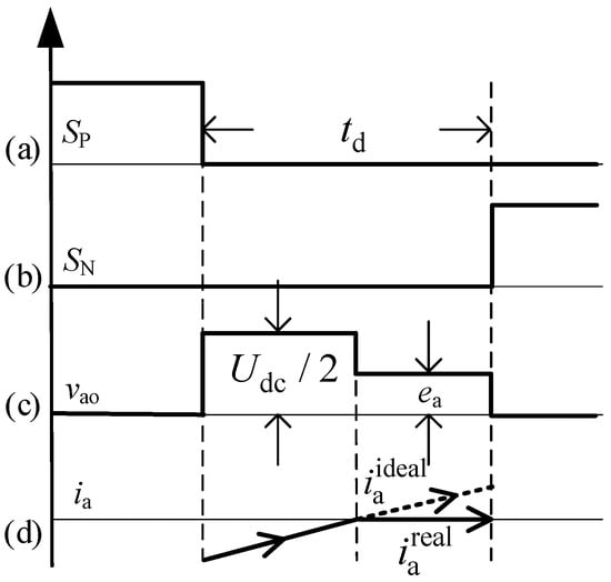 The zero current clamping phenomenon is mainly caused by the dead-time. The phase current crosses the zero point during the dead-time; both the upper and lower phase legs are turned off at this time. Due to the interaction between the back electromotive force and the DC bus voltage, the diode that should continue to flow after zero crossing cannot be turned on. As a result, the current is clamped at the zero and cannot smoothly cross zero during the entire dead-time until the next switching signal arrives. If the driving voltage provided by the controller is insufficient, the current may remain near zero for multiple PWM periods, and a current “stage” will appear. Shown in Figure 4a,b are the upper and lower phase leg driving signals, (c) is the actual voltage vao between point a and point o, the dotted line in (d) is the ideal current after crossing the zero point, and the solid line is the actual current .
