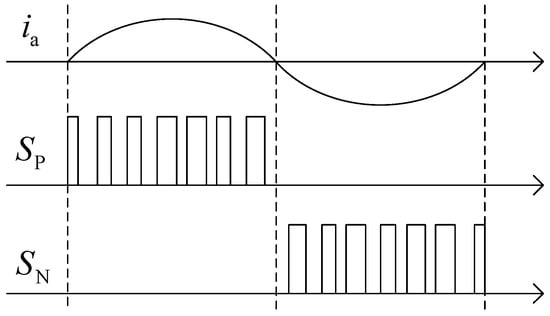 According to the analysis in Section 2.2, the zero current clamping effect occurs when the phase current crosses zero, and it is difficult to be suppressed through voltage compensation. Therefore, a novel modulation scheme for the phase current crossing zero in advance is proposed in this paper; the diagram is shown in Figure 6. When ia crosses zero from positive to negative, to accelerate the zero crossing process of ia, the upper switching signal SP remains off-state, and the lower switching signal SN remains on-state. When ia crosses zero from negative to positive, the upper switching signal SP remains on-state, and the lower switching signal SN remains off-state. Due to generating the maximum voltage, whose polarity is the same as the changing direction of ia, the zero current clamping effect only occurs during a very short time, and it has little impact on the phase current. In addition, the dead-time is also eliminated when ia crosses zero, because no action occurs in the switching signals.