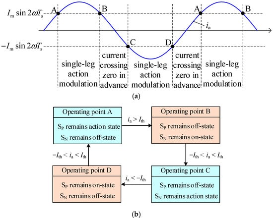 During the experiment, the A/D sampling is triggered by the PWM signal. After the A/D conversion is completed, the interrupt service program is entered to update the modulation strategy and comparison value register of the next period. Therefore, there is a time interval of less than Ts between the A/D sampling time and the start time of the next PWM period. The zero crossing moment may be located at any position in this PWM period. The maximum time interval between the A/D sampling moment of the PWM period modulation strategy (i.e., the A/D sampling moment in the previous PWM period) and the zero crossing moment in this PWM period is determined to be 2 Ts, and the absolute value of the phase current at this time is |Imsin2ωnTs|. Therefore, Imsin2ωnTs and −Imsin2ωnTs are used as two threshold values and compared with the real-time sampling value of the phase current, determining the modulation scheme to be applied for the next PWM period. The diagram for the switching principle of the two modulation schemes is shown in Figure 7a; four operating points (A, B, C, and D) are defined for comparison with ia and shown as follows: