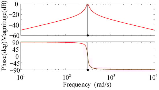 where is the damping ratio; is the resonance frequency of the filter. should be equal to the electrical angular frequency of the IM. When is larger, the response speed is faster, but the high-frequency component attenuation is smaller, so the value of should be chosen reasonably. After multiple simulations and comparisons, is set as 0.05 in this paper. The Bode plot of F(s) under = 100π rad/s is shown in Figure 8. The amplitude and phase of F(s) are 0 dB and 0 deg at 100π rad/s, and it has an attenuation effect on all other harmonic components.