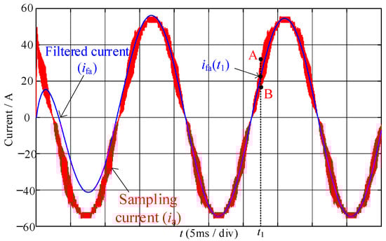 Next, the necessity of extracting the fundamental will be explained, combined in Figure 9. At t1 moment, affected by the current ripple and sampling burrs, the sample value of the phase current may be ia(A) or ia(B), and there is significant error between them. However, incorrect sampling values may result in inappropriate modulation algorithms being used in the next switching period, so this paper adopts the fundamental component obtained by the proposed digital filter as the basis for selecting the modulation. The flow chart of the modulation selection based on the digital filter is shown in Figure 10.