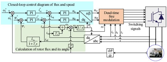 A closed-loop control model of flux and speed was designed in a two-phase rotating coordinate system (d-q axis), the diagram that contains the field-oriented control detail, is shown in Figure 12. It is a two closed-loop control system. Two PI controllers control the speed (ωr) and the rotor flux (ψr) to eliminate the steady-state errors, and the references of the phase current ( and ) in d-q axis are obtained. Then, the current inner loop adopts two PI controllers to obtain the references of the voltage (ud and uq) in the d-q axis. After the Clarke transformation, the references of the voltage (uα and uβ) in the two-phase station coordinate system are obtained and are used as the inputs for the dead-time free modulation strategy proposed in this paper. The amplitude of the rotor flux (ψr) is calculated by the current model, which is expressed as follows: