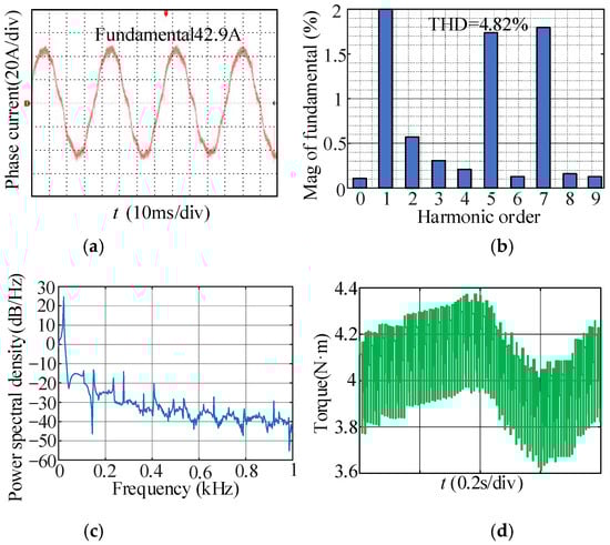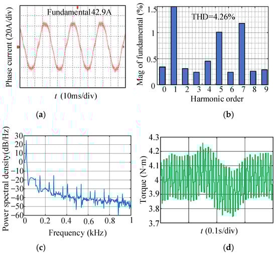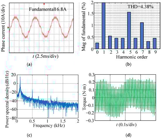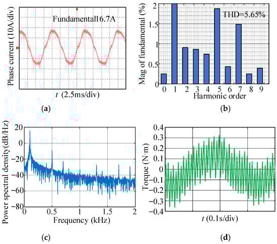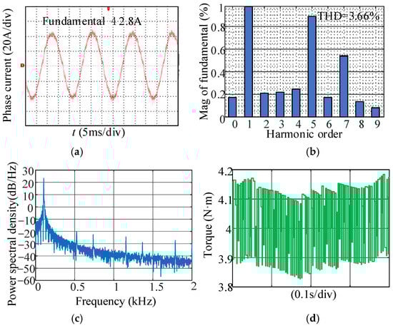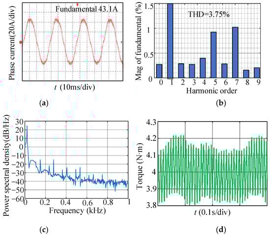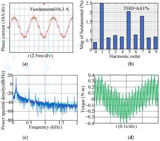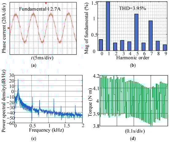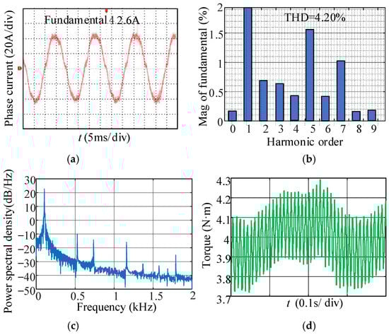 Experimental waveforms under compensation of the pulse duration when IM operates at 1500 r/min and 4 N·m. (a) Phase current. (b) Harmonic analysis results. (c) Power spectral density. (d) Torque.
