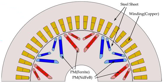 The overall structure of the eight-pole, forty-eight-slot (8P48S) interior PMSM is shown in Figure 1. The motor model consists of the core, magnets, rotor core, stator core, and winding. The magnet placement in the rotor adopts a double V-shaped structure. The stator and rotor cores are made of steel, specifically 50CS1000 (China Steel Corporation, Taiwan, China), while the winding is copper. There are two types of magnetic pole materials: neodymium iron boron (NdFeB) and ferrite.