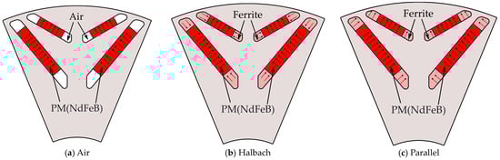 Ferrite materials, on the other hand, can be processed into irregular shapes and embedded into these gaps, making full use of the space and enhancing motor performance [26]. The study compares motor performance with three different magnetization methods: no ferrite filling (air), Halbach arrangement, and parallel magnetization, which are presented in Figure 2. For structure a (air), which is the motor structure without adding ferrite, and for structure b (Halbach), this structure is selected due to its magnetic focusing effect. This method has already been used in research on brushless DC (BLDC) motors, and studies have shown that this Halbach method can improve motor performance [27,28]. For structure c (parallel), the same magnetization direction as NdFeB is used. The idea is to utilize previously unused areas to enhance the permanent magnet flux linkage of the motor.