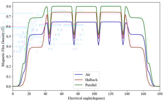 The magnetic flux density diagrams of the three structures are shown in Figure 3. Compared to the structure without ferrite, the addition of ferrite enhances and concentrates the magnetic field. Figure 4 shows the air gap magnetic flux density diagrams for the three structures, where the structures with ferrite have significantly increased air gap magnetic flux density, with the parallel magnetization method resulting in the highest air gap magnetic flux density.