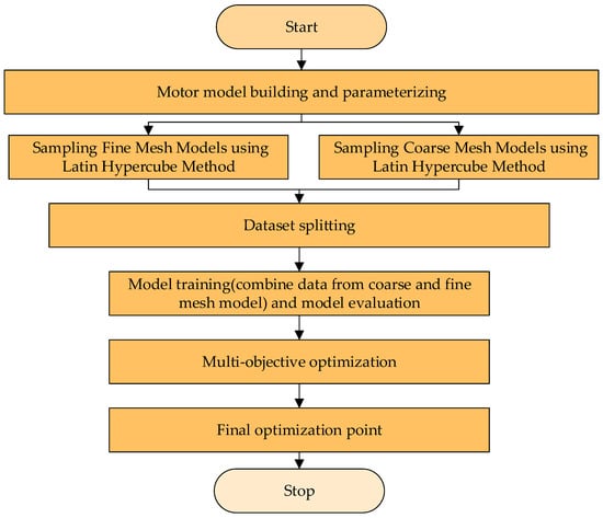 The flow chart of this strategy is shown in Figure 7. The entire strategy starts by creating a finite element model of the motor and parameterizing it. After selecting the parameter variable change space, the design experiment (Latin hypercube sampling) method is used to sample and perform FEA calculations to obtain the dataset. It is worth noting that this strategy simultaneously samples the coarse mesh model and the fine mesh model and uses the data from both to perform model training.