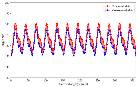 For finite element analysis, the accuracy of its calculation results is related to the precision of mesh division. The finer the mesh division, the more accurate the calculation results are, but at the same time, it also takes longer. Figure 10 shows the average torque data obtained through finite element simulation using the above coarse and fine mesh divisions. The horizontal axis represents the electrical angle, the vertical axis represents the average torque, the red curve represents the fine mesh data, and the blue curve represents the coarse mesh data. The error between the data obtained from the fine mesh and the data obtained from the coarse mesh calculation is shown in Figure 11.