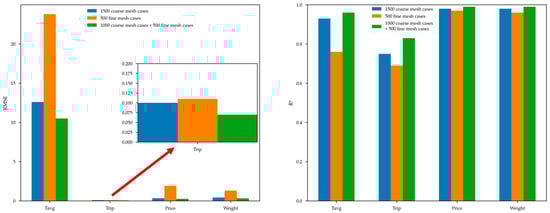 As shown in Figure 15, the evaluation metrics R2 and RMSE of the model trained on three different datasets, namely 1500 coarse mesh data, 500 fine mesh data, and 1000 coarse mesh data + 500 fine mesh data, are plotted. The specific values are shown in Table 3. Among them, the group of 1000 coarse mesh cases + 500 fine mesh cases have better indicators.
