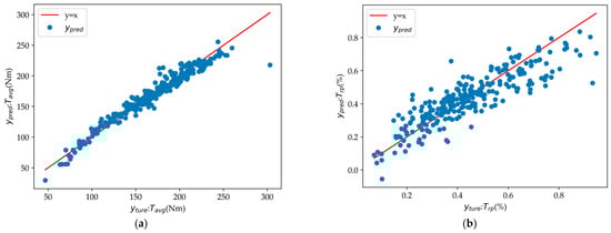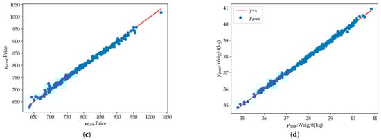 R2 and RMSE charts. (a): Graph of predicted and actual average torque values; (b): Graph of predicted and actual torque ripple values; (c): Graph of predicted and actual cost values; (d): Graph of predicted and actual mass (weight) values.