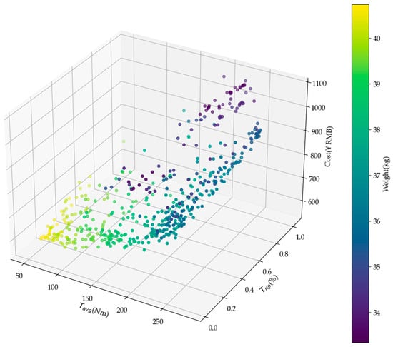 Cost serves as an important part of motor design [29]. For the optimization objectives, the optimization objectives set here are average torque, torque ripple, total cost of materials, and weight of the motor. For torque ripple and cost, it is hoped that the smaller, the better, and for the average torque, it is hoped that the larger, the better. It can be represented by the following Formula (3).