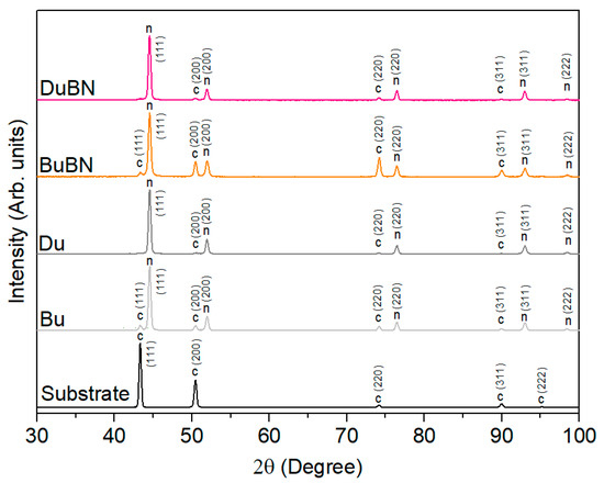 XRD patterns of the substrate, undercoatings (Bu and Du) and double-layered nickel coatings (BuBN and DuBN). Assignment of the diffraction peaks is indicated as follows: c—copper; n—nickel.