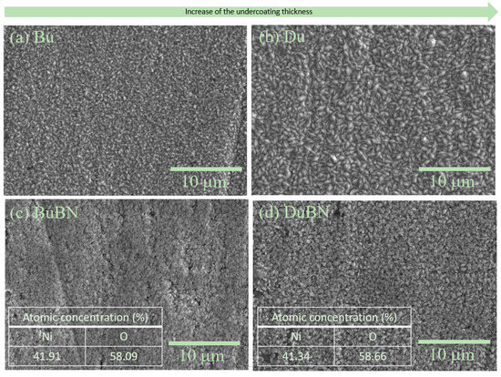 The black nickel film surfaces, as shown in Figure 4c,d, are also compact but consist of smaller grains with less defined polyhedral shapes, especially in the BuBN sample, which aligns with the nature of the undercoatings’ morphology and their impact on the formation of the black layer.