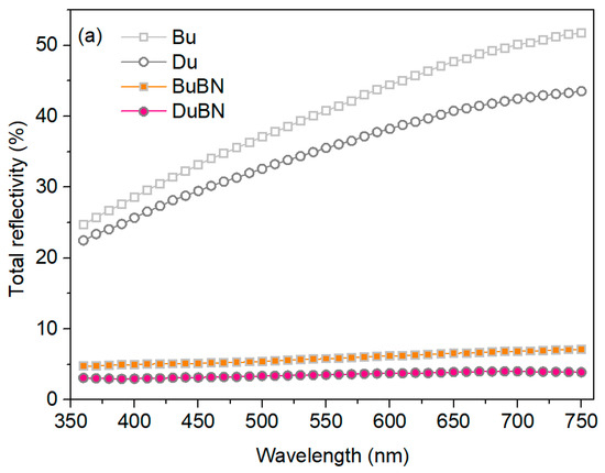 As expected, the bright nickel has higher total reflectivity than the dull nickel, which increases, in both cases, with the increase in the wavelength. In the case of the black films, the total reflectivity is almost wavelength independent. Nonetheless, the slightly higher values for the BuBN coating show that the undercoating’s influence on the surface morphology of the black layers impacts the reflectivity. Regarding the diffuse reflectivity, the increase in this component suggests a rougher and less uniform coating, meaning that the black films have a smoother surface than the undercoatings, as was already observed in the surface micrographs in Figure 4.