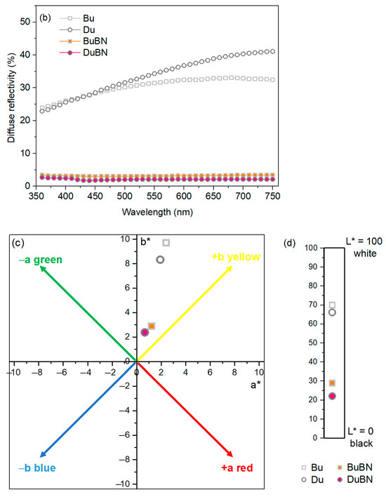 Reflectivity spectra: (a) total reflection and (b) diffuse reflection; (c) CIE L*a*b* color diagram; and (d) brightness of the undercoatings (Bu and Du) and black nickel coatings (BuBN and DuBN).