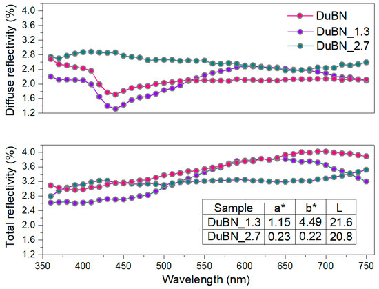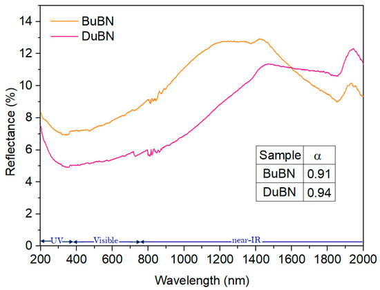For both samples, it is observed that the reflectance is lower in the UV–visible range but begins to increase in the near-infrared region. Around 1400 nm, the reflectance of BuBN starts to decrease, while that of DuBN remains stable, at least until 1800 nm, where a band can be observed in both cases.