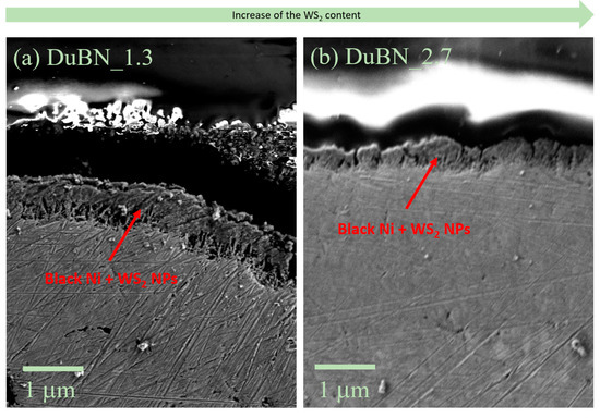 The cross-sections of the double-layered nickel coatings with WS2 nanoparticles, the samples DuBN_1.3 and DuBN_2.7, were analyzed by SEM, as shown in Figure 7. The estimated thicknesses changed from (0.6 ± 0.1) μm and (0.4 ± 0.12) μm, respectively.