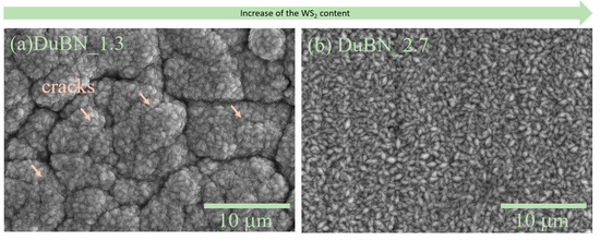 Figure 9 displays the surface SEM micrographs of the double-layered nickel coatings with WS2 nanoparticles, revealing that the deposits have no obvious pinholes or pits. The DuBN_1.3 sample presents visible and open grain boundaries, however, with the grains showing the same polyhedral structure identified in the corresponding black nickel film without nanoparticles. A closer examination reveals the presence of some cracks.