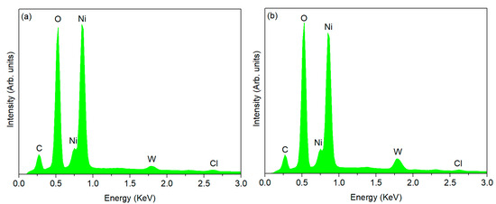 The overall analysis indicates that the films contain a minor amount of chlorine, implying its incorporation during the electrochemical deposition of black nickel. Furthermore, as expected, the incorporation of WS2 nanoparticles increases with their higher concentration in the electrochemical bath, as seen by the higher intensity W signal (note that the sulfur signal is overlapped in the EDS spectra with the W signal).
