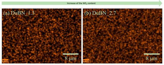 Figure 11 presents the elemental mapping of the element W for the DuBN_1.3 and DuBN_2.7 samples. Consistent with the information obtained from the EDS spectra, it is visible that the content of WS2 nanoparticles in the deposited films increases according to their concentration in the electrochemical bath. Additionally, the nanoparticles are evenly distributed in both cases, without visible clusters or segregations.
