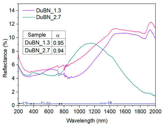 For the DuBN_1.3 sample, it is observed that the reflectance is lower in the UV–visible range but begins to increase in the near-infrared region. Around 1500 nm, the reflectance stabilizes, at least until ≈1800 nm, where a band can be observed. This trend was already observed in relation to the DuBN film.