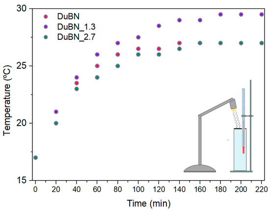 Heating curves of the DuBN, DuBN_1.3 and DuBN_2.7 samples (inset: diagram illustrating the experimental setup used to evaluate the conversion of solar into thermal energy).
