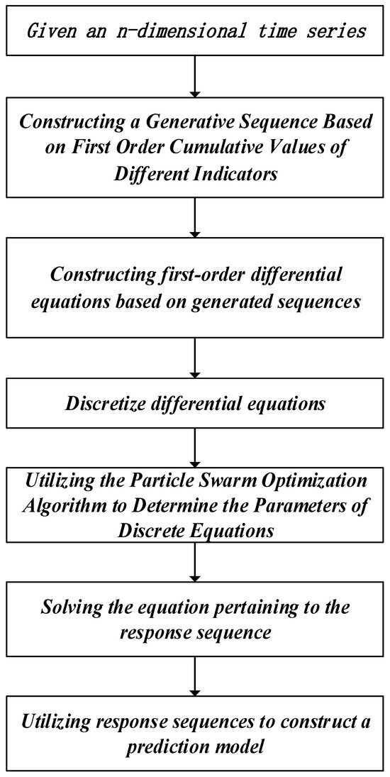 MGM (1, n) is derived from the GM (1, 1) model, but it is not a linear combination of the GM (1, 1) model. It is a multivariable grey forecasting model. For the MGM (1, n) model, the interpolation coefficient γ = shengbei0.5 reduces the fitting accuracy of the model, resulting in low prediction accuracy. Therefore, it is necessary to optimize the interpolation coefficient to improve the fitting accuracy and prediction accuracy of the model. In this paper, parameters were inserted into the MGM (1, n) model to optimize the interpolation coefficient of this model. Furthermore, this paper combines the particle swarm optimization algorithm and fitness function to solve parameters. Figure 1 shows the methodological diagram of the MGM (1, n) model. The procedures of the improved MGM (1, n) could be deduced as follows.