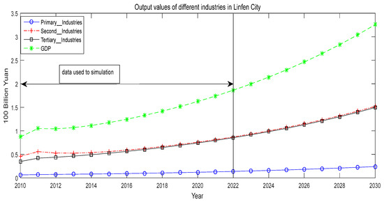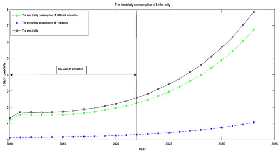 Taking into account factors such as technological advancement, economic size, policy changes, and the overall GDP of the nation, we discovered that the electricity demand in Linfen City is expected to experience further growth in the future. By integrating the model’s features with the economic development trends and power consumption factors in Linfen City, the improved MGM (1, n) model was employed to forecast both the city’s GDP and its overall power consumption. The forecasting results and simulation data of different industries in Linfen City are shown in Table 6 and Figure 3. The interpolation coefficients of the simulation model are 0.8032, 0.8920, and 0.6983, respectively. The GDP is estimated at CNY 325.74 billion in 2030. The primary, secondary, and tertiary industries in Linfen City are CNY 24.1 billion, CNY 152 billion, and CNY 149.6 billion, respectively (see Figure 1).
