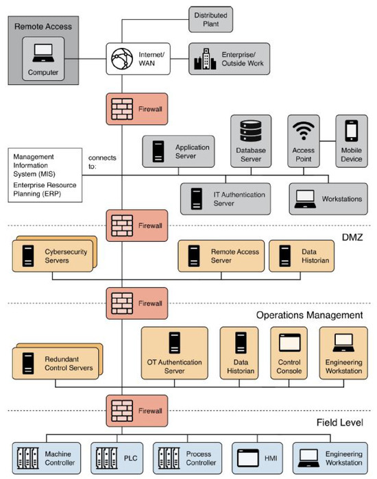 - Stouffer, K.; Pease, M.; Tang, C.; Zimmerman, T.; Pillitteri, V.; Lightman, S.; Hahn, A.; Saravia, S.; Sherule, A.; Thompson, M. Guide to Operational Technology (OT) Security; Technical Report SP 800-82 Rev 3, NIST; US Department of Commerce, National Institute of Standards and Technology: Gaithersburg, MD, USA, 2023.