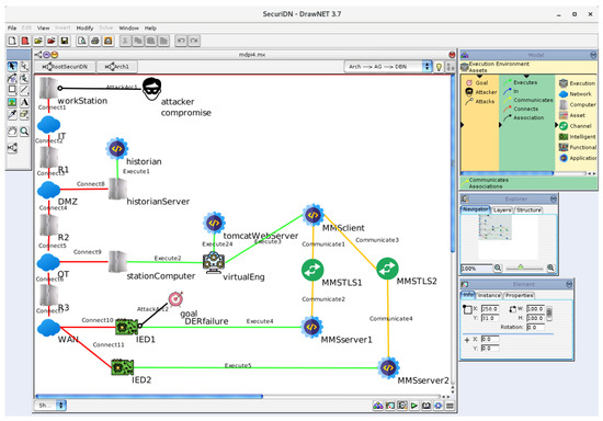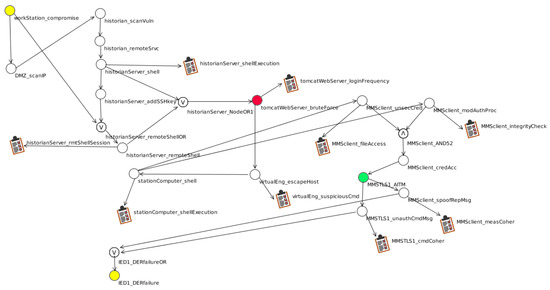 The reference architecture of the case study considered in this paper is inspired by the architecture of Figure 1. Although a more structured architecture with several protection layers between the corporate and the OT networks is typically implemented, we chose a simpler architecture for a more manageable but still realistic example. To move from the corporate network to the OT network, potential attackers will need to traverse a single DMZ (more levels of protection would require more lateral movements, exploiting different vulnerabilities), or even, as the 2015 and 2016 attacks to Ukraine grids show [26,27], often attackers manage to obtain user credentials to progress through networks. In this paper, we refer a simplified, but realistic, use case where the included components and configurations are taken from knowledge of the real energy networks and occurred attacks.