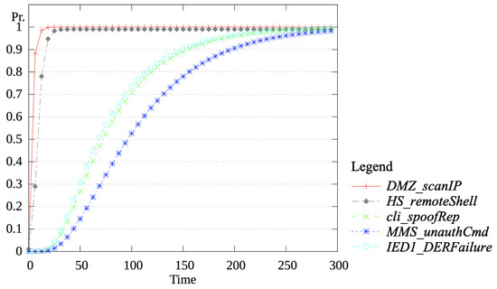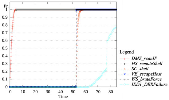 In [19], a dynamic risk assessment model for Cyber Physical Power Systems (CPPSs) is proposed, focusing on assessing the network security vulnerabilities of SCADA systems in substations, as well as the physical consequences these vulnerabilities could have under malicious control. A key feature of the framework is the computation of the probability of successful exploitation for each vulnerability based on characteristics extracted from the Common Vulnerability Scoring System (CVSS), additional temporal information related to the disclosure time and an attribute characterizing the attacker’s skills. Based on this pre-computed information, a Probabilistic Attribute attacking-path Graph is defined and the maximum likelihood path from the starting exploited vulnerability to the target attacker’s goal is determined. The model also estimates the physical consequences of the cyberattack by calculating the minimum load shedding in N-1 contingencies, simulating the impact of a successful attack on the SCADA system that could lead to the tripping of transmission lines and generators, resulting in cascading failures and load shedding in the power system. Compared with this solution, SecuriDN uses a MAL-derived AG formalism that can represent more complex interdependencies between attack steps within the modeled infrastructure. While this framework in [19] considers only the best path leading the attacker to its predefined goal based on the pre-computed attach step probabilities, SecuriDN evaluates all the possible attack paths from the initial node to the target node, computing the probability of successful exploitation over time based on the estimated completion times and the interdependencies between attack steps.