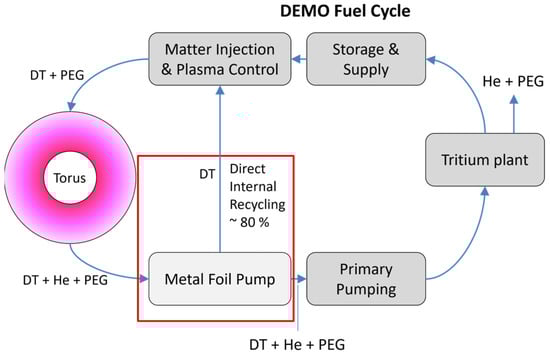 EU-DEMO is a next-generation Tokamak in plan within the framework of the EUROfusion Consortium. It is foreseen to operate in pulsed mode: the plasma will be heated to achieve nuclear fusion in the burn phase. In the dwell phase, the magnetic field coils of the Tokamak are recharged and the vessel is evacuated down to a base pressure in the mPa regime for pulse preparation []. One challenging but key task in EU-DEMO is to reduce the tritium inventory to levels that are acceptable for a nuclear regulator []. As a solution to this issue, a smart fuel cycle architecture is proposed based on the concept of Direct Internal Recycling (DIR), as shown in Figure 1 []. Here, a Metal Foil Pump (MFP) separates a large fraction of the unburnt hydrogen isotopes coming from the divertor [,,] by exploiting a phenomenon called superpermeation. This introduces a short-cut in the fuel cycle for the unburnt fuel and greatly reduces the size of the separation stages in the tritium plant, thus reducing the tritium inventory.
