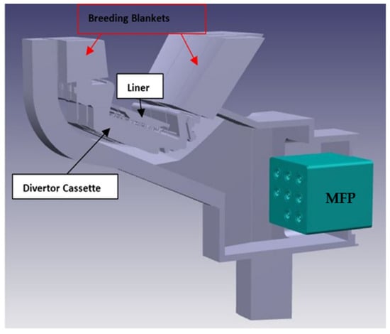 The MFP is foreseen to be installed inside the DEMO lower port as shown in Figure 2 and the downstream primary pumping is planned as linear diffusion pumps with a baffle system at the inlet [,,,]. The lower port is of complex geometry, contains various pipe routings, and will be used as the port for remote maintenance activities. In the burn phase of the Tokamak, the lower port must provide not only the necessary pumping speed for helium and Plasma Enhancement Gases (PEGs), but also the necessary pumping speed and sufficient separation efficiency for hydrogen isotopes in the torus exhaust gas mixture. The MFP does not have to be operated in the dwell phase since there is no significant throughput of fuel to be separated. Therefore, it will only impose an additional vacuum conductance resistance during dwell, which has to be considered during system design. Obviously, it is a hard task in the MFP design to meet all these requirements in both operational phases of EU-DEMO, and three different MFP design configurations are proposed.