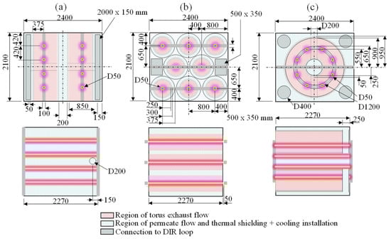 Three different designs of the MFP, as shown in Figure 5, are studied in this paper. The dimensions of the MFP in all three designs are L = 2.27 m, width W = 2.4 m and height H = 2.1 m. In the sandwich design (Figure 5a), there are two channels of the width b = 0.75 m and height h = 2.1 m, with two arrays of four plasma sources of d = 0.05 m diameter each, and with vertical foil segments as the sides of the channels. In the tube design (Figure 5b), there are eight cylindrical tubes with an outer diameter D = 0.5 m, at which cylindrical metal foils are installed. The plasma source is installed in the center of the cylinder. In the halo design (Figure 5c), there are two concentric tubes made of metal foils, and the diameters of the inner tube and the outer tube are D1 = 0.6 m and D2 = 1.8 m, respectively; eight plasma sources of d = 0.05 m are circularly distributed between the inner and outer tubes. In addition, a horizontal tube of a diameter of 0.2 m close to the MFP outlet in the sandwich design is foreseen and the mechanical structures to support the plasma sources in three designs, such as the bars or rings close to the MFP inlet and outlet, are also simplified and included in the simulation model. Thus, the most important cross-sections in the MFP are the torus exhaust flow cross-section as well as the permeate flow cross-section as part of the DIR loop.